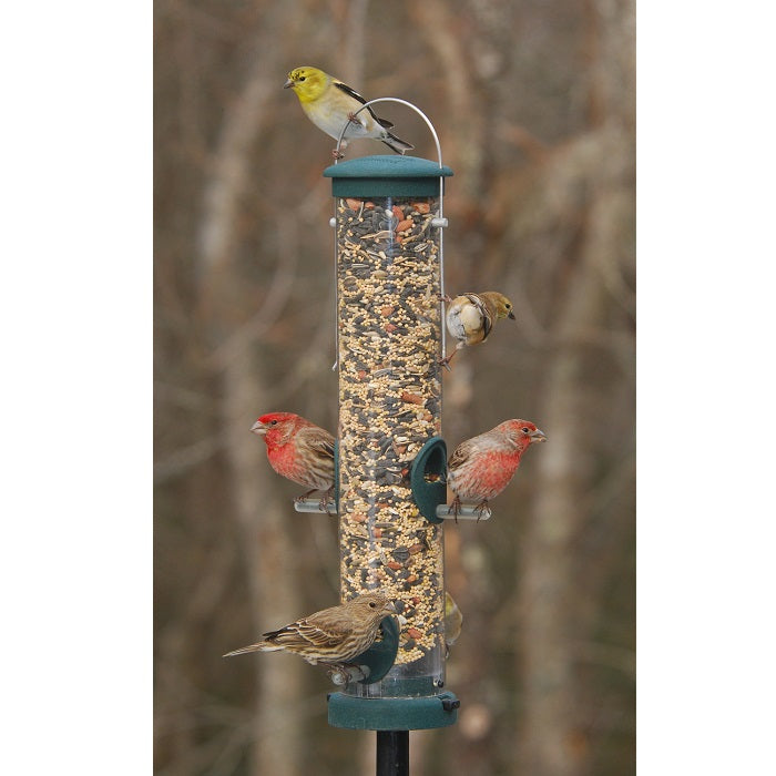 Seed tube feeders can be filled with a variety of seed types such as Sunflower, safflower and specialty seed blends. Quick-Clean Seed feeders are constructed of heavy duty zinc die-cast components, UV stabilized polycarbonate 2 3/4″ diameter tube, and stainless steel hardware. The Quick-Clean removable base makes it easy to keep your birdfeeder fresh and clean, and your birds healthy and happy. To remove, simply push the buttons and the base easily slides out. One easy step makes cleaning the feeder a snap. This feeder combines heavy die-cast metal caps, ports, bases and a clear UV stabilized polycarbonate tube combine to make it last. The built-in seed deflector in the base allows birds to remove every last seed.